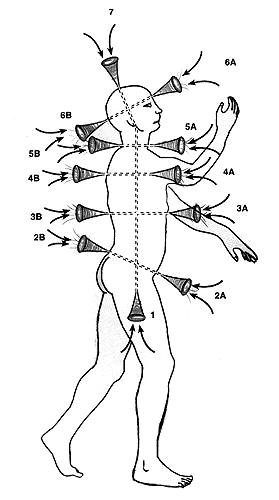 Deci, o chakră are un focar, un punct de unde iradiază (sau intră) energie sub forma unei pâlnii. Iată, în Fig.1, un prim model aproximativ al celor 7 chakre principale. Ele au focarele dispuse pe o linie verticală ce trece prin mijlocul corpului. Se observă că chakrele extreme (cea de la baza trunchiului nr.1 şi cea din creştetul capului nr.7) se deschid pe verticală. În schimb celelalte 5 chakre sunt orientate perpendicular pe trunchi şi au două deschideri: una în faţă şi alta în spatele corpului (numerotate 2A şi 2B, 3A şi 3B, 4A şi 4B, 5A şi 5B, 6A şi 6B).